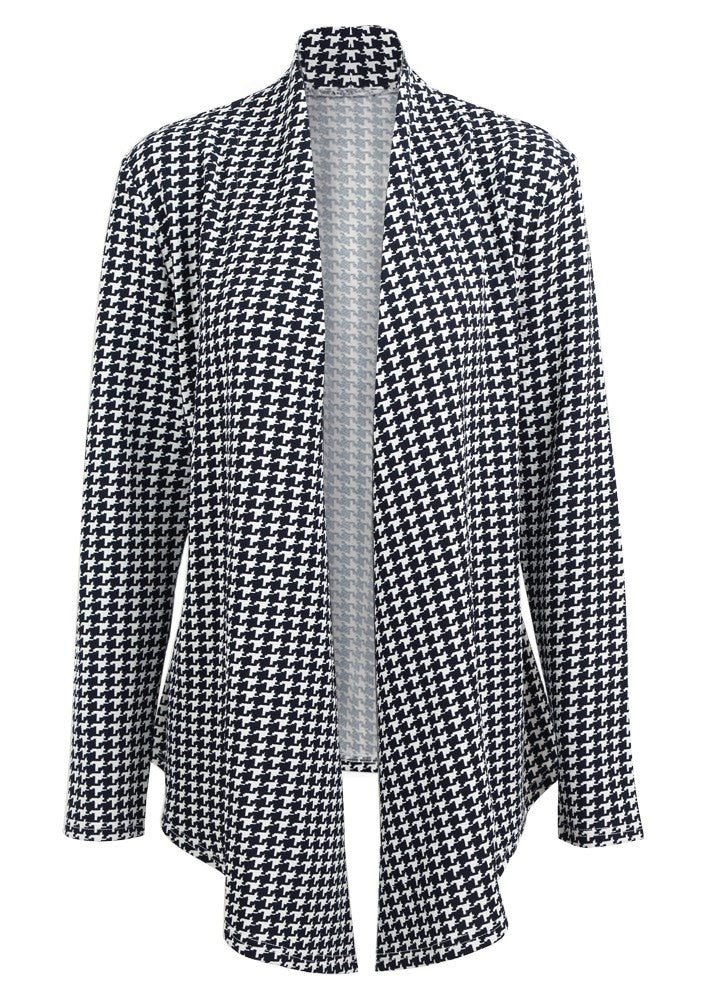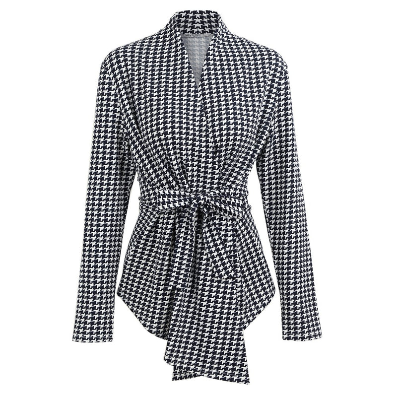 Women Houndstooth Plaid Cardigan Coat Long Sleeves Open Front Waist Strap Asymmetrical Casual Tops Outwear