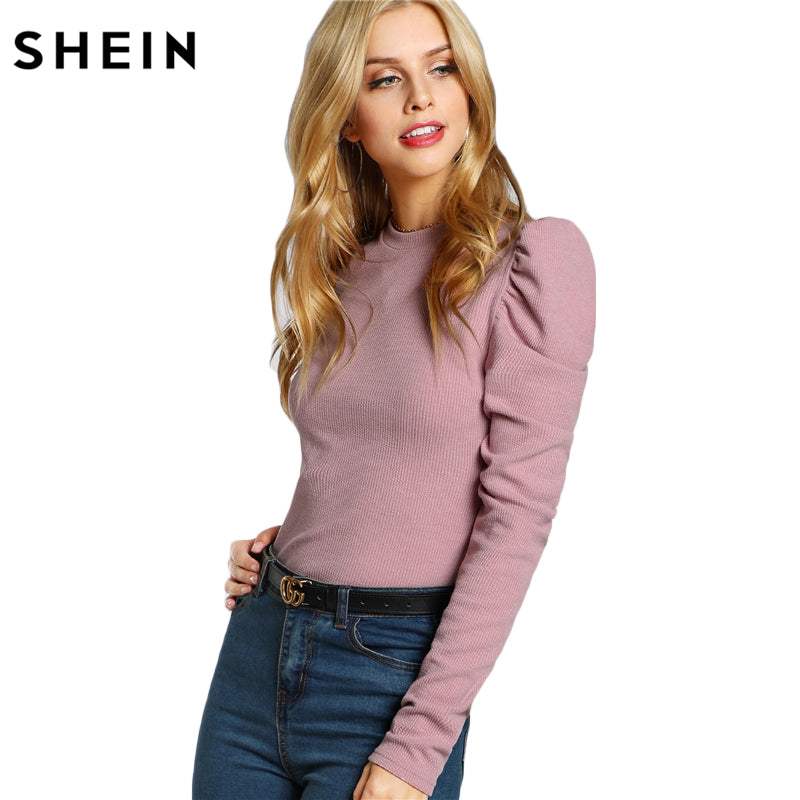 SHEIN Elegant Women T shirt Clothes Women Pink Long Sleeve O Neck Tee Shirts Slim Fit Puff Sleeve Rib Knit T-shirt