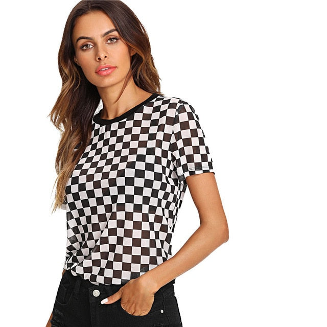 SHEIN Plaid Print Semi Sheer Tee Women Round Neck Short Sleeve Clothing Sexy T-shirt 2018 Summer New Casual Checkered Top Tee