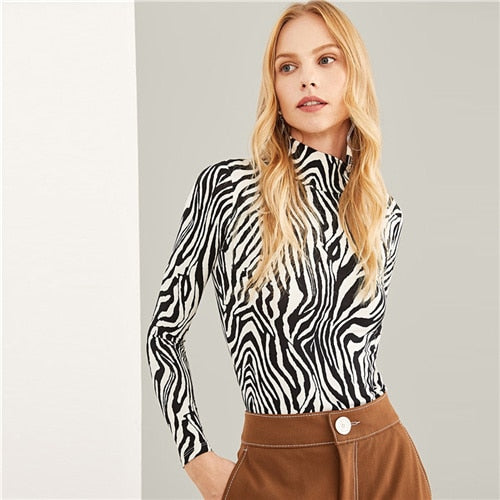 SHEIN Black And White Highstreet High Neck Zebra Print Pullovers Long Sleeve Tee 2018 Autumn Workwear Women T-shirt And Tops