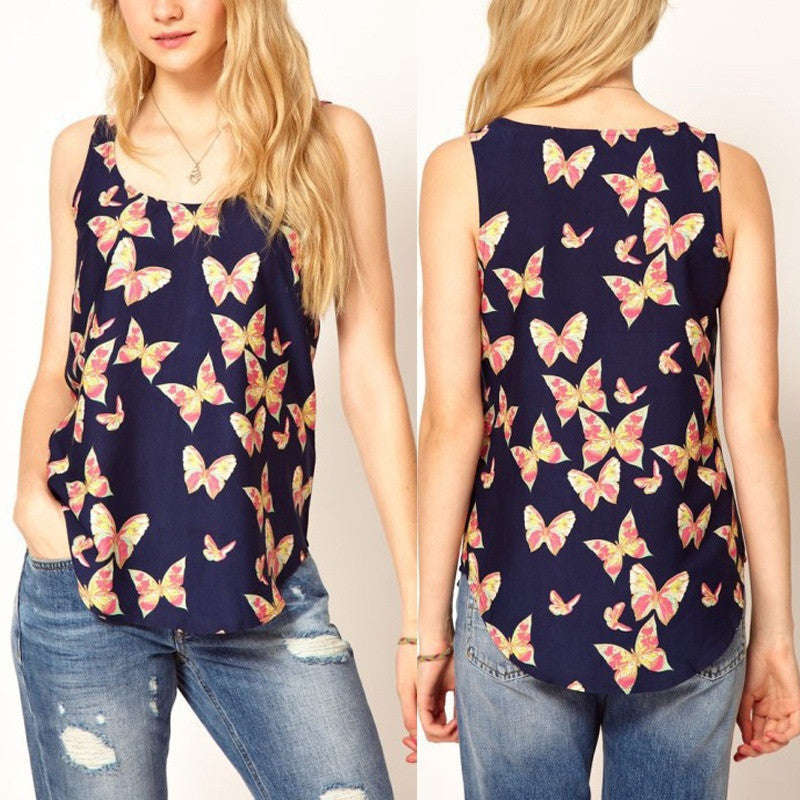 Fashion Women Butterfly Print Sleeveless Casual Chiffon Blouse T Shirt Tank Top